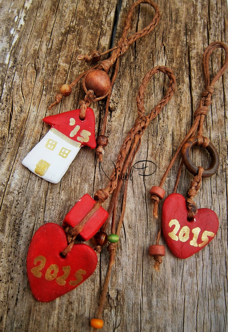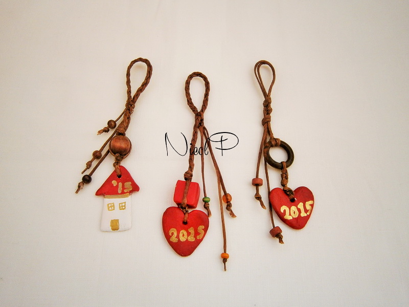 Γούρια μπρελόκ, διακοσμητικά από πηλό και κερωμένο σπάγκο,
