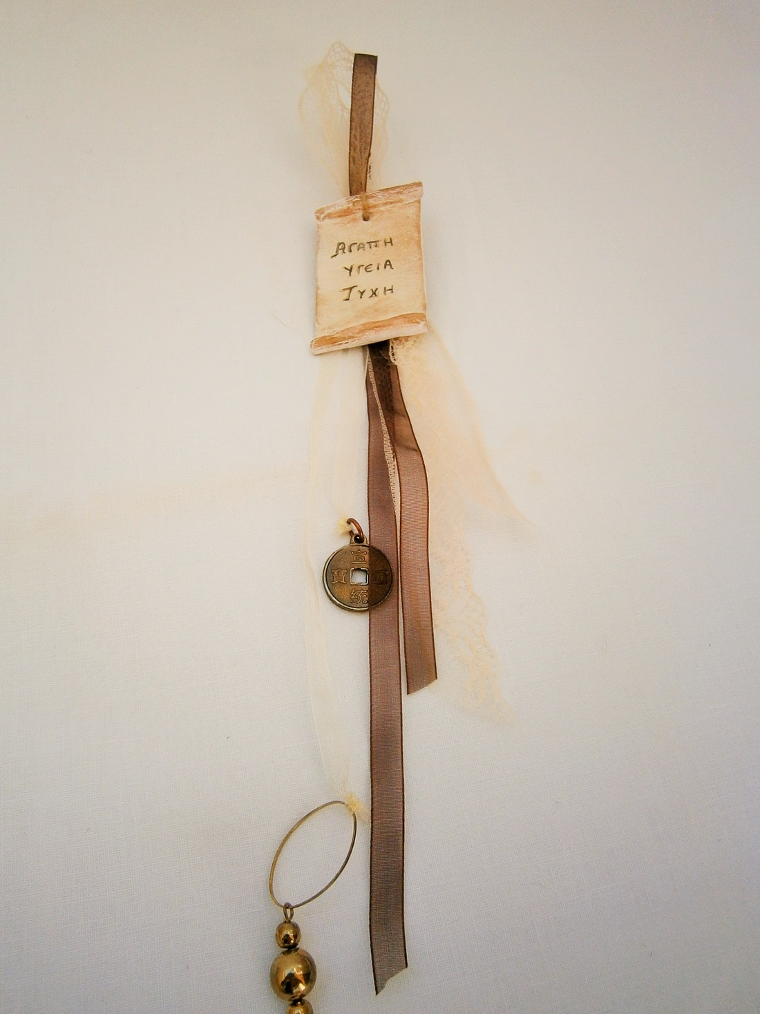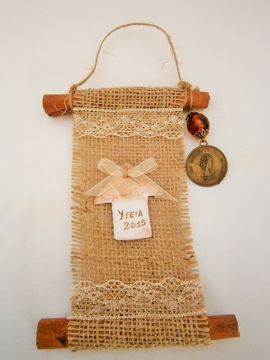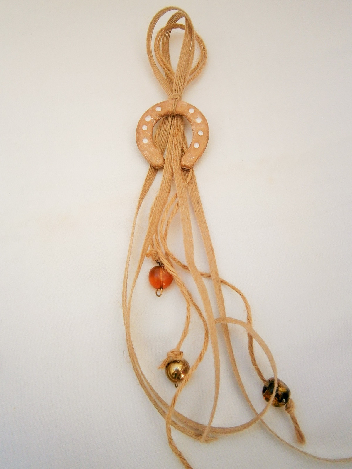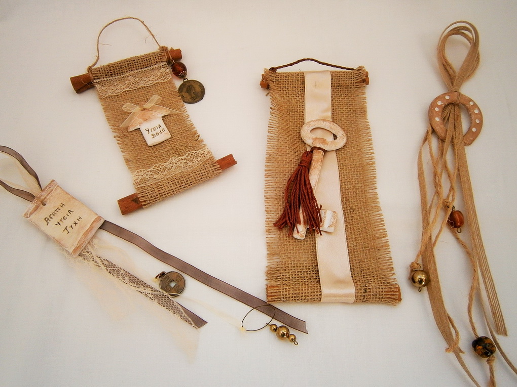 χειροποίητα γούρια, σε αποχρώσεις μπρονζέ και γήινες, στυλ ρετρό, διακοσμητικά από πηλό..