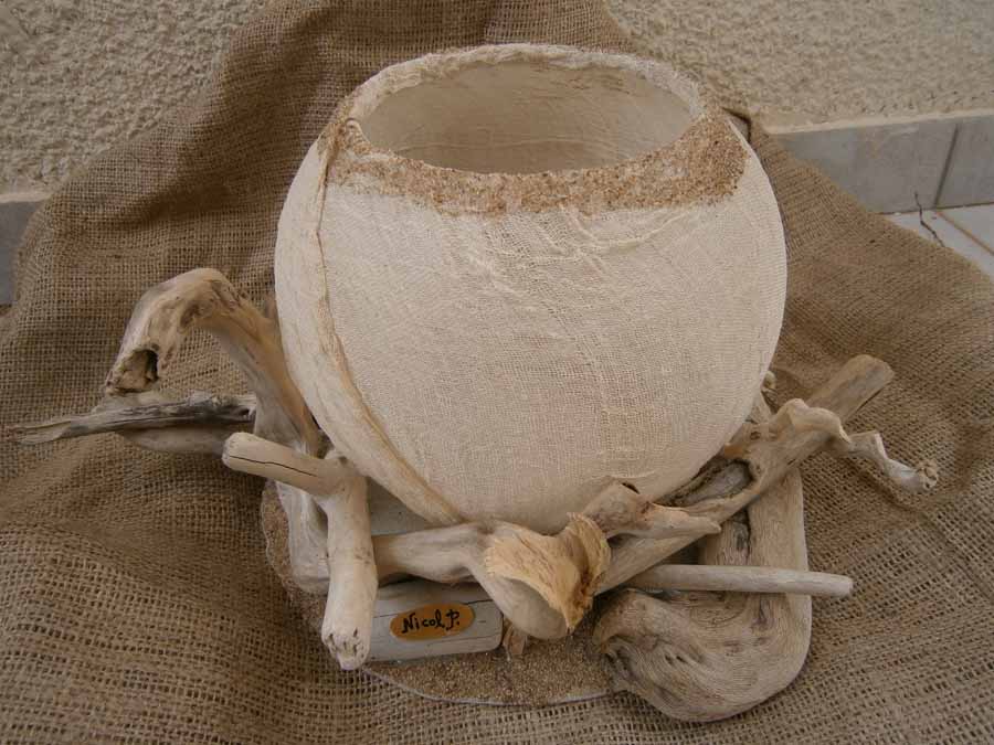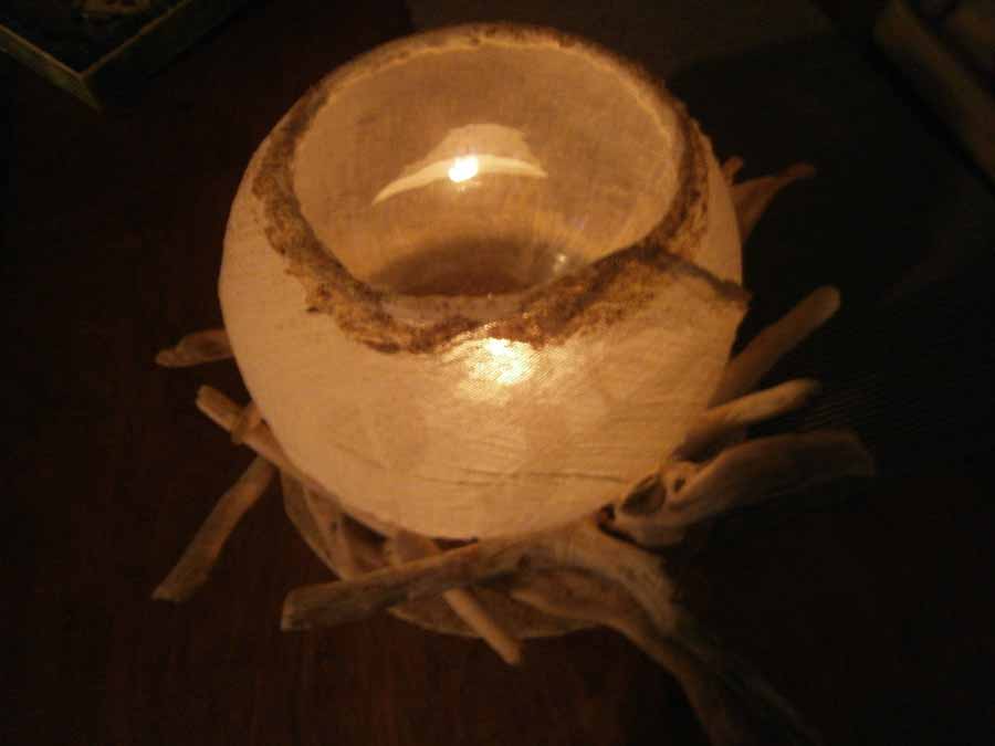 Γυάλα- κηγοπήγιο ντυμένη με γάζα και άμμο πάνω σε βάση με driftwood ακτίνες