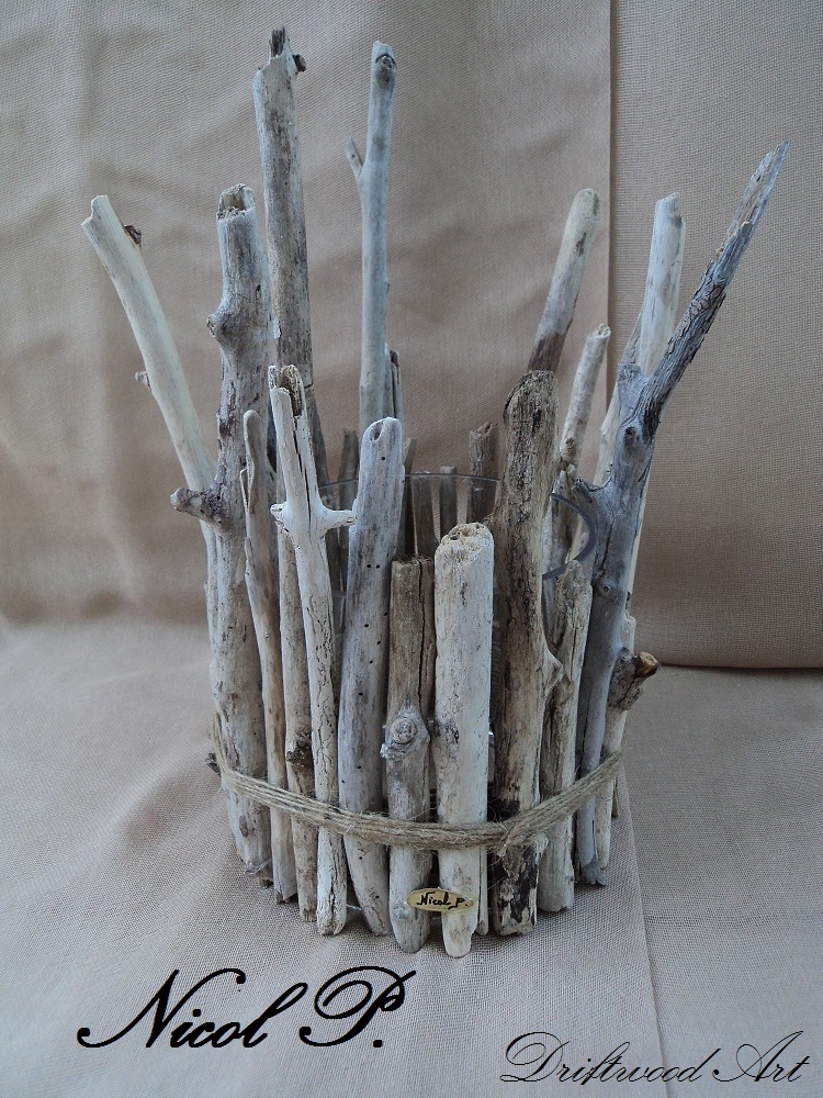 Γυάλα – κηροπήγιο ντυμένη με φυσικά θαλασσόξυλα, 0,28 ύψος Χ 0,20 (μαζί με θαλασσόξυλα, ενδέχεται να υπάρχουν μικρές αποκλείσεις στις διαστάσεις λόγω μη συγκεκριμένων διαστάσεων στα θαλασσόξυλα)
