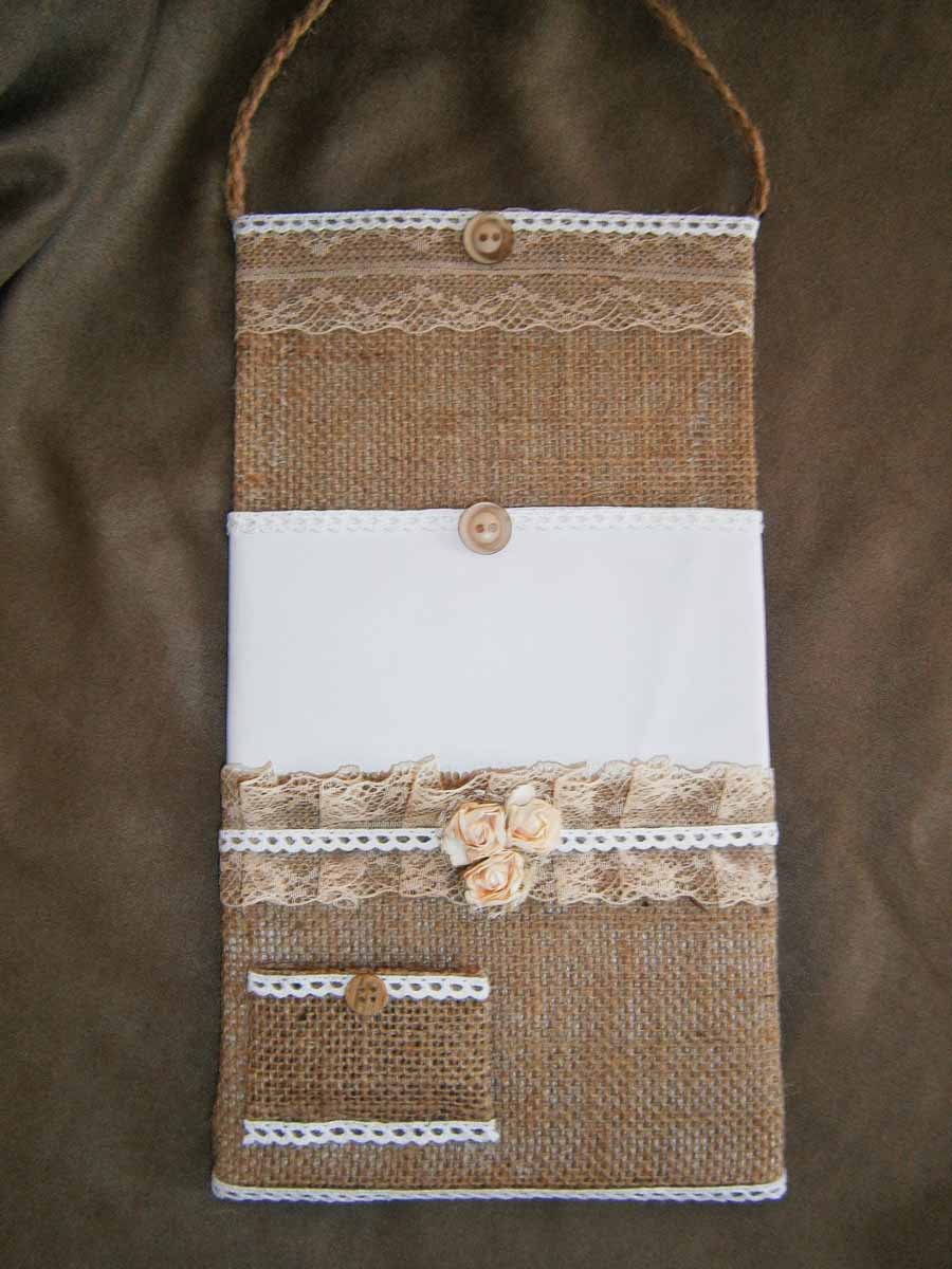 πολυχρηστική θήκη από λινάτσα, λευκό δέρμα και δαντέλες, 30Χ12