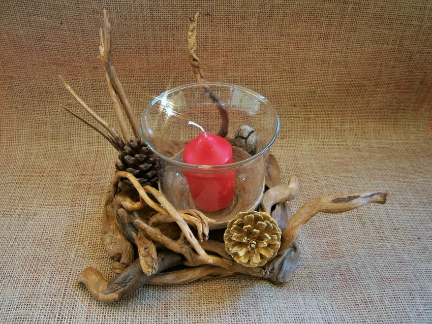 Κηροπήγιο επεξεργασμένο driftwood με λεπτομέρειες βελανίδια και κουκουνάρια, 14Χ13