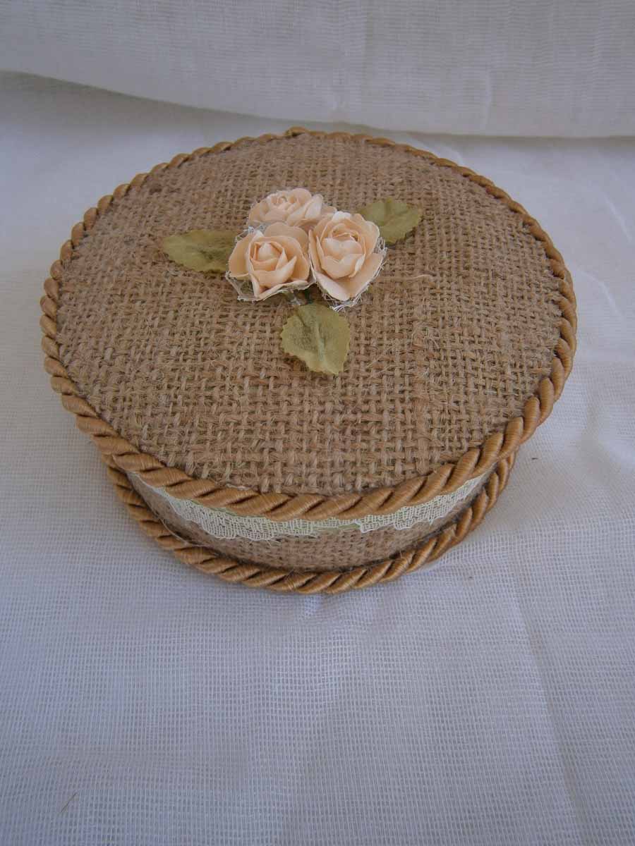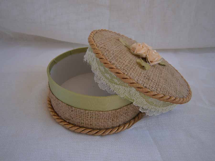 Στρογγυλή μπιζουτιέρα, λεπτομέρειες λινάτσα, δαντέλα άνθη