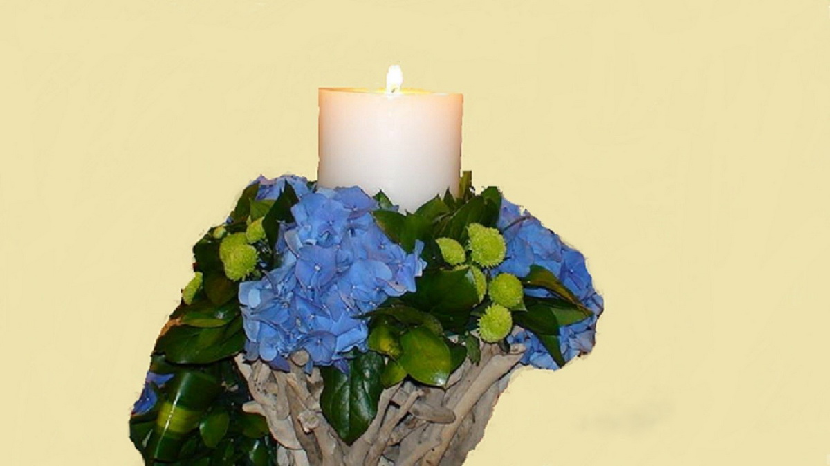 στολισμός γάμου με θαλασσόξυλα και μπλε ορτανσία