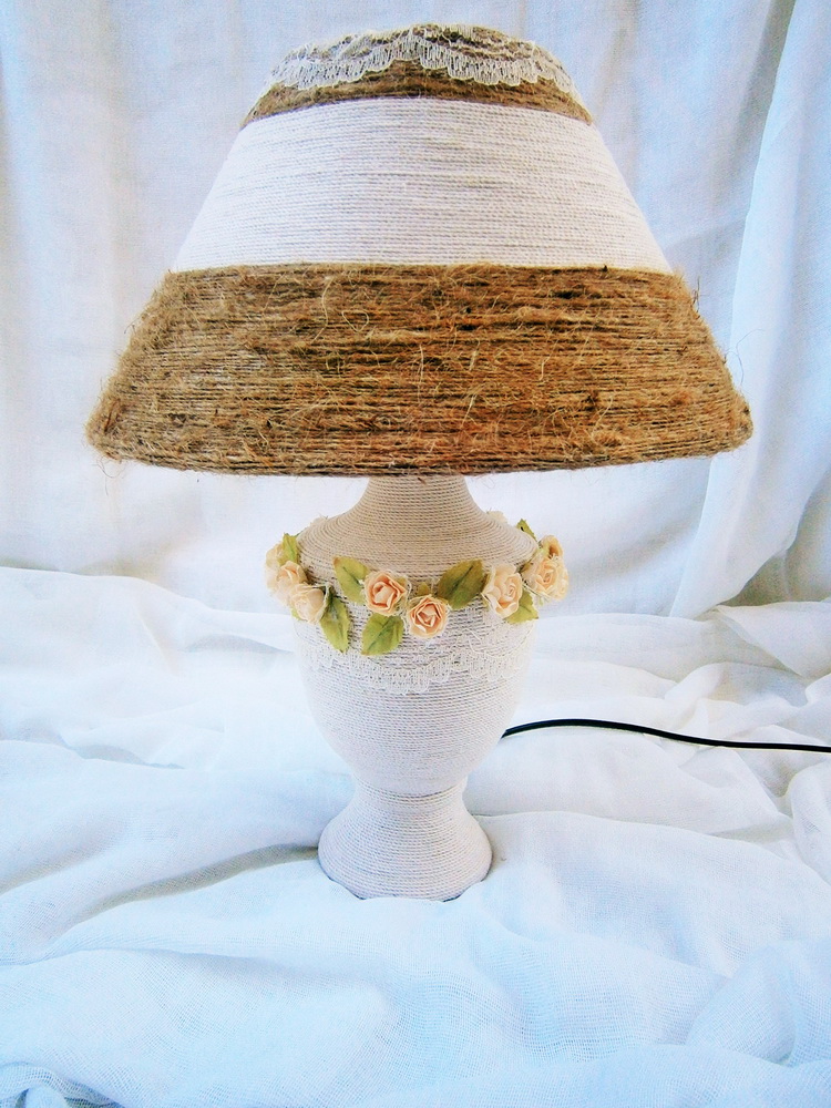 Φωτιστικό, ρομαντικό πορτατίφ σπάγκος, δαντέλα και σομόν λουλουδάκια, 36 cm ύψος
