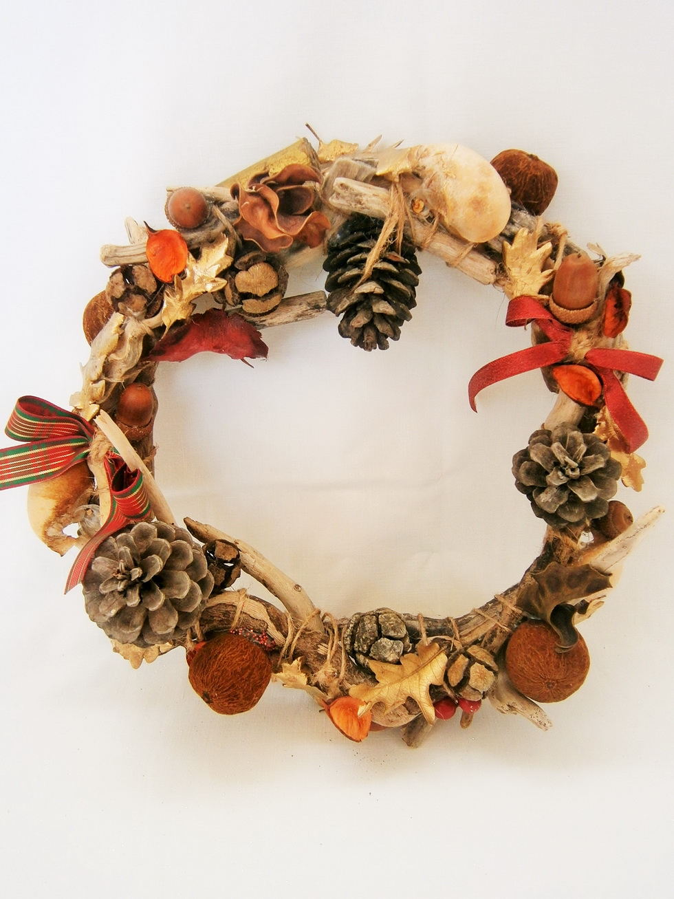 χριστουγεννιάτικο στεφάνι από θαλασσόξυλα στολισμένο με κουκουνάρια και βελανίδια, 25Χ25